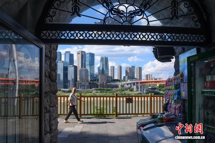 图为8月17日,从“洞见山城”防空洞内拍摄的重庆城市景观。中新社记者 何蓬磊 摄