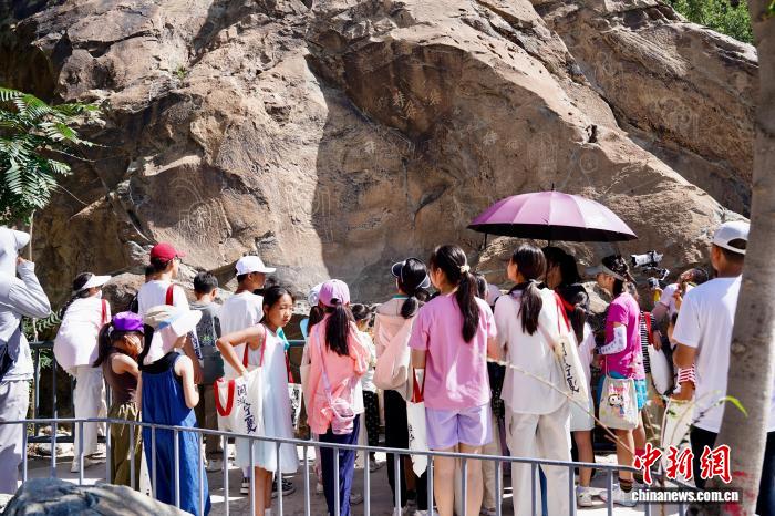 近日,在贺兰山岩画景区内,阳光透过岩壁洒在蜿蜒的木栈道上,一群孩子在专业讲解员的引领下,被一幅幅蕴含着历史深意的岩画深深吸引。这场以“绿游寻古迹、童心绘文明”为主题的暑期绿色研学之旅,让孩子们近距离感受这份来自远古的震撼。