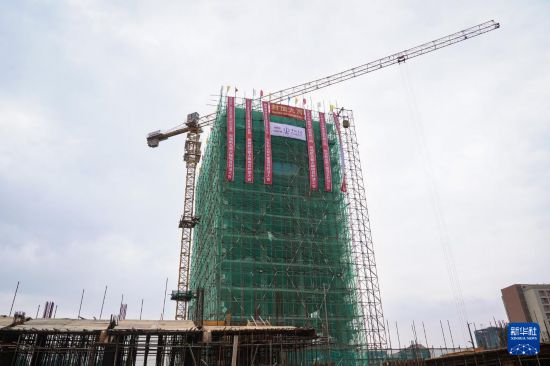 这是8月18日在埃塞俄比亚首都亚的斯亚贝巴拍摄的埃塞俄比亚航空公司总部大楼项目主建筑封顶仪式。新华社记者 韩旭 摄