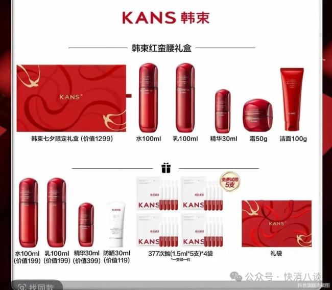 北京商报记者了解发现,在韩束(上美股份旗下主要护肤品牌)抖音旗舰店内,销量最高的产品是红蛮腰礼盒装,售价399元,内含5件产品(爽肤水、乳液、精华、面霜、洁面),同时购买即送赠品,赠品包含红蛮腰柔肤水、柔肤乳、精华;防晒乳;377亮白棒20支,合共10款产品,平均每款39.9元,比单独购买精华等产品便宜不少。同时,在其旗舰店内,大部分单品价格在百元左右,部分产品跌破百元。