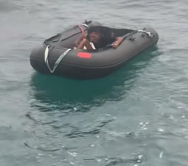 果然,橡皮艇外沿伸着一只脚。渔民呼唤了几声,艇内的男子疲惫地招了下手。渔民急忙扔过去绳子,但男子已经没有力气抓住。渔民只好把船靠上去,几个人合力把他抬到了渔船上。