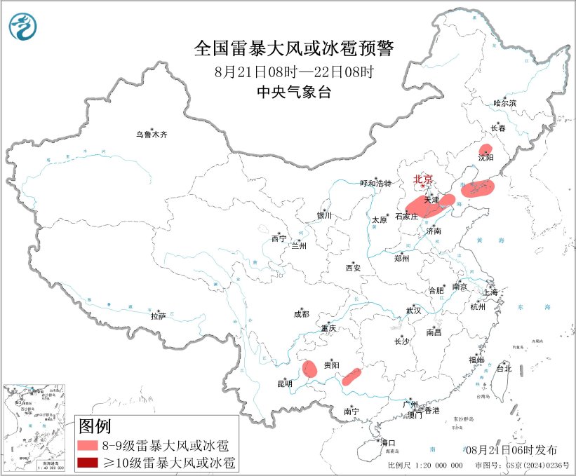 预计,8月21日08时至22日08时,内蒙古东北部、黑龙江中南部、吉林中部、辽宁中北部、陕西东部和南部、山西中南部、河北中部和东北部、北京大部、天津、四川盆地西部和南部、贵州西部和南部、云南、广西北部等地部分地区有大到暴雨,其中,吉林中部、辽宁北部、河北中部和东北部、天津南部、四川盆地南部、贵州西南部、云南东北部、广西北部等地部分地区有大暴雨(100~180毫米)。上述部分地区伴有短时强降水(最大小时降雨量20~50毫米,局地可超过80毫米)。河北中南部、山东北部、辽宁中部和南部、贵州西南部、广西北部等地的部分地区将有8级以上雷暴大风或冰雹天气。中央气象台8月21日06时继续发布暴雨蓝色预警和强对流天气蓝色预警。