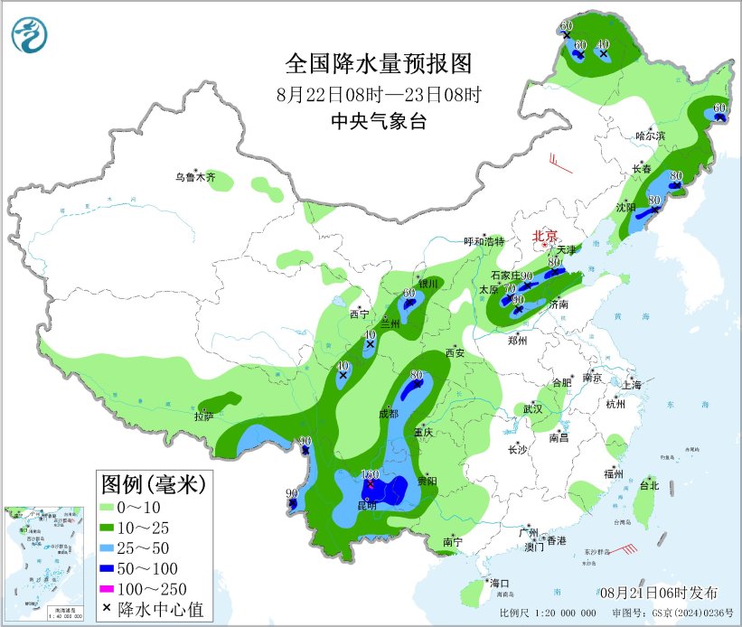 8月21日08时至22日08时,内蒙古东部、东北地区大部、西北地区东部、华北大部、山东中北部、河南西部、西南地区大部、华南西部等地部分地区有中到大雨,其中,内蒙古东北部、黑龙江中南部、吉林中部、辽宁中北部、陕西中部、山西中部、河北中南部和东北部、北京东部、天津中北部和南部、四川盆地西部和南部、贵州西部和南部、云南、广西西南部和北部等地部分地区有暴雨,局地大暴雨(100~180毫米)。内蒙古中东部有4~6级风,东海北部海域将有5~7级风、阵风8级,北部湾将有5~6级风、阵风7级。