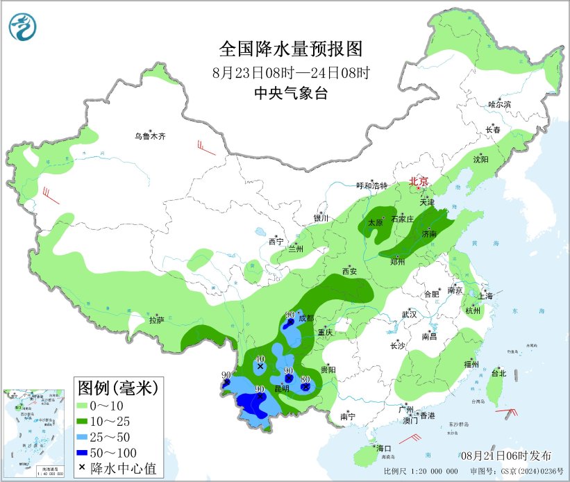 8月23日08时至24日08时,山西中部、黄淮东部、西南地区大部等地部分地区有中到大雨,其中,四川盆地西南部、云南西南部和中部等地部分地区有暴雨(50~90毫米)。新疆西南部和东部有4~6级风,南海西南部和北部海域、台湾海峡、巴士海峡将有4~6级风、阵风7级。