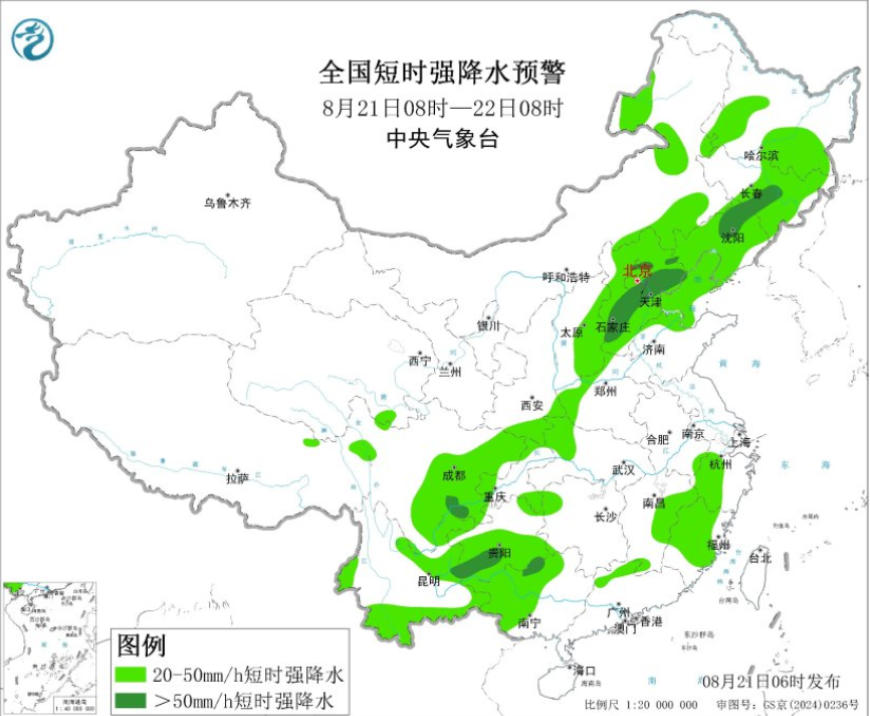 预计8月21日08时至22日08时,华北大部、内蒙古东部、东北地区中南部、西南地区东部和南部、华南西部、江南东部等地的部分地区将有小时雨量大于20毫米的短时强降水天气,其中,河北中南部和东北部、北京北部山区和东南部、天津、辽宁中北部、吉林中东部、四川盆地东南部、贵州西南部、云南东北部、广西北部等地的部分地区小时雨量大于50毫米,最大可达80毫米以上;河北中南部、山东北部、辽宁中部和南部、贵州西南部、广西北部等地的部分地区将有8级以上雷暴大风或冰雹天气。