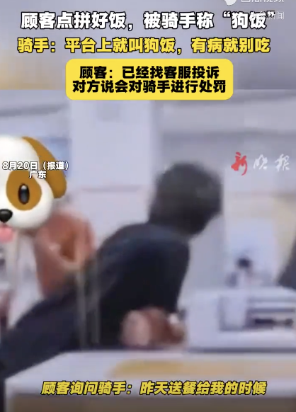 顾客点拼好饭,被骑手称“狗饭”。顾客询问骑手为什么当面叫“狗饭”,骑手称平台就是叫“狗饭”,有病就别吃。