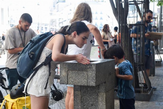 8月4日,一名女子在西班牙马德里街头补水。新华社发(古斯塔沃·巴连特摄)
