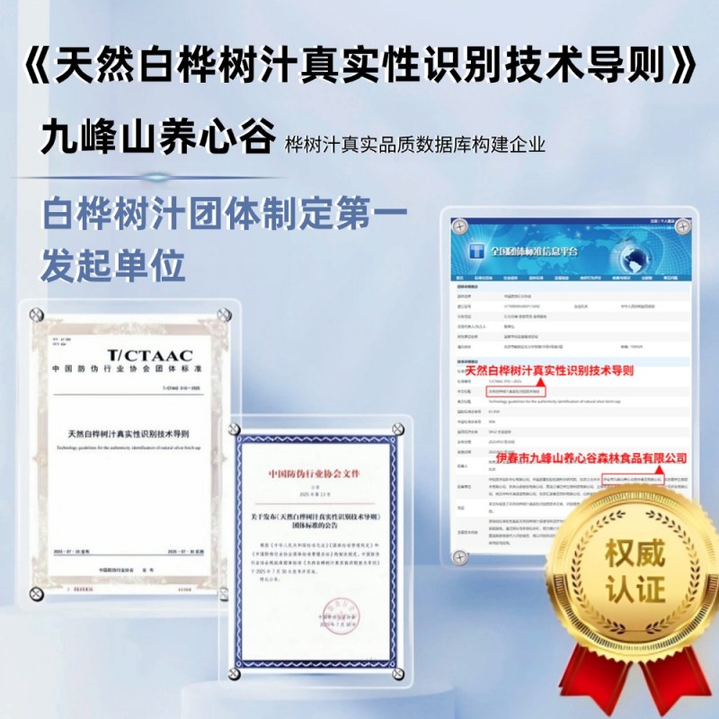 每年春雪初融、白桦树萌发叶芽前的12-15天,是兴安岭天然白桦树汁的黄金采汁期。这是伊春市九峰山养心谷森林食品有限公司(以下简称:九峰山养心谷)在其产业实践中始终遵循的自然节律。2025 年7月30日,《天然白桦树汁真实性识别技术导则》团体标准正式发布并同步实施,这份来自寒地黑土的白桦树汁,终于迎来了科学的真实性识别依据。作为该标准的起草单位之一,九峰山养心谷不仅深度参与了标准的制定过程,更期待这份以核磁共振氢谱指纹图谱为核心的技术导则,能为白桦树汁行业搭建起一道守护天然的屏障。