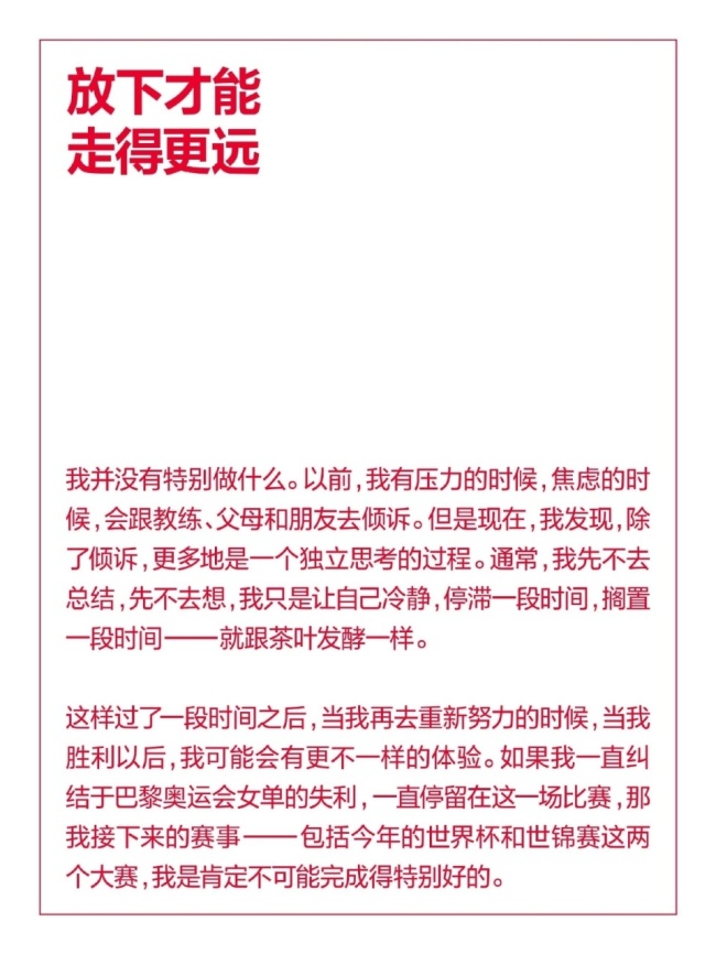 在家期间,她反复问自己是否能接受再次失败,是否有勇气继续打下一届奥运会。只有接受了失败,才能展望未来。她逐渐打开了心结,接受了失利,意识到人生不止有奥运会。她发现,除了倾诉,更多时候需要独立思考,让自己冷静一段时间,就像茶叶发酵一样。