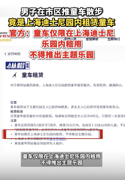 上海迪士尼回应童车被推到市区马路:童车仅限在上海迪士尼乐园内租用