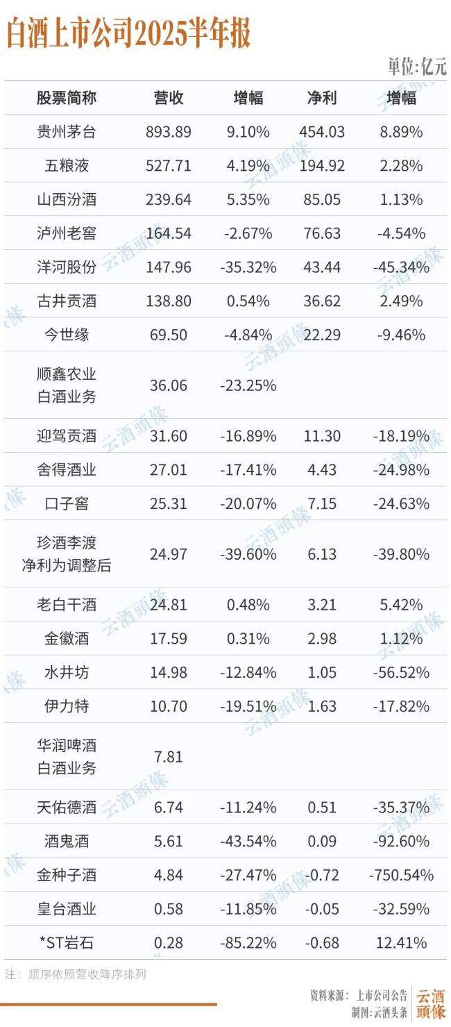 但其中的反映出的一些重要数据,也值得行业重视。一是利润下滑,59.7%的酒企营业利润减少,核心原因是高端消费受阻;二是库存增加,行业平均存货周转天数达900天,反映出主流渠道承压能力下降;三是现金流下行,表明渠道受阻、动销压力加大。云酒·中国酒业品牌研究院高级研究员、亮剑咨询董事长牛恩坤认为,2025年酒业依旧延续过往表现,呈现出营收利润增速放缓、分化加剧、渠道库存高压、价格倒挂等特征,其中保持4%以上增速的白酒企业只有贵州茅台、五粮液、山西汾酒、古井贡酒,反映了渠道高库存、消费需求萎缩和行业信心不足。“2025年上半年,行业面临着社会经济、相关政策、行业周期与消费环境等诸多挑战。”云酒·中国酒业品牌研究院高级研究员、知趣咨询总经理蔡学飞表示,半年报数据显示白酒行业整体承压态势明显,行业依然面临深度调整。这种调整突出表现为:量价齐跌,高端酒批价倒挂严重,库存周转天数持续高位,多数企业面临价格与渠道多重压力;消费结构剧变,政务及商务宴请需求锐减,婚宴和家庭自饮成主力场景,消费价格带向100-300元大众价格带下沉;行业集中度进一步提升,头部效应强化,头部企业占据营收和利润垄断性优势,中小酒企普遍业绩腰斩;电商、即时零售等新模式不断涌现,冲击传统经销渠道;消费者理性回归,对于产品功能之外的品牌文化与场景体验需要不断提高。云酒·中国酒业品牌研究院高级研究员、谏策咨询总经理刘圣松认为,2025年的酒企半年报基本与行业深度调整现状相印证。具体表现为头部酒企增长失速,利润出现下滑;二三线酒企投入增大,但业绩普遍不及预期,企业加速分化;部分问题企业加速下滑,表现堪忧。“十亿看企业规律,百亿看行业规律,千亿看经济规律,万亿看国家及世界规律。”千里智库创始人欧阳千里分析,按照这一逻辑,多数酒企业绩下滑恰恰是受到企业、行业发展周期的影响。只有茅台、五粮液两家企业的规模均在千亿以上,基本上跳出行业周期的影响,更多的是受经济周期的影响。云酒·中国酒业品牌研究院高级研究员、新零售专家鲍跃忠认为,2025年上市酒企的半年报不乏亮眼表现者,有一定代表性,但是还不能完整代表整个行业的实际,更不能影响对行业转型的思考和研究。看企业:分化加剧