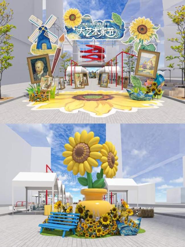 现场特别设置了梵高、莫奈、米勒、塞尚等艺术大师的名画打卡装置,共同构建了一场穿越奥赛展的艺术之旅。这些名画被转化为可游走、互动和拍摄的立体空间,让观众可以步入“梵高的房间”,沉浸在画中氛围;徜徉在金黄的“麦田”和“巨型向日葵”之间,感受印象派的色彩律动;穿梭于“奥赛名画墙”,捕捉与经典的同框瞬间。艺术在这里不再是远观的对象,而是成为可亲历的现实场景,赋予公众置身画作的独特感受,让艺术、自然与都市生活在前滩的空间中融为一体。