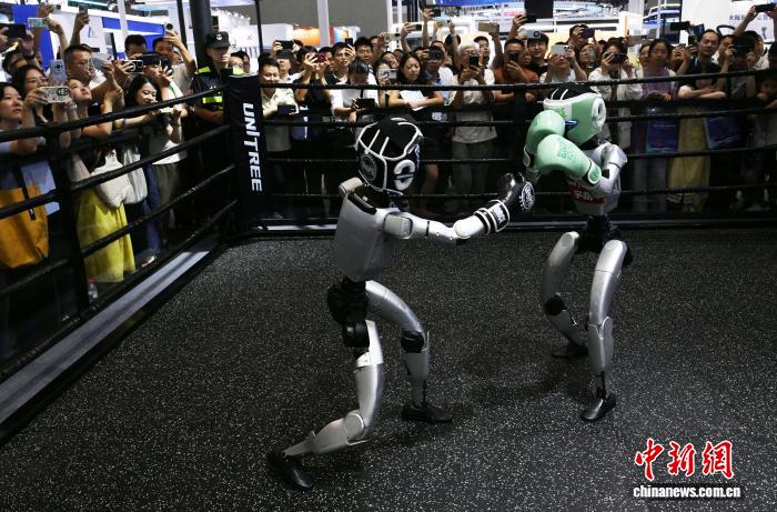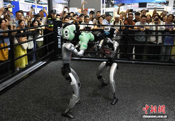 9月5日,2025世界智能产业博览会在重庆开幕。活动现场,宇树科技携人形机器人举行了一场拳击比赛,吸引民众围观。图为机器人在比赛前与观众互动。中新社记者 周毅 摄