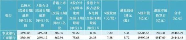 根据Wind最新数据,农业银行和工商银行的总股本分别约为3500亿股和3564亿股。其中,农业银行的A股股本占总股本的91%左右,港股股本占比约为9%;而工商银行的A股股本占总股本的76%左右,港股股本占比约为24%。从流通股比例来看,两家银行的流通股均占总股本的100%。