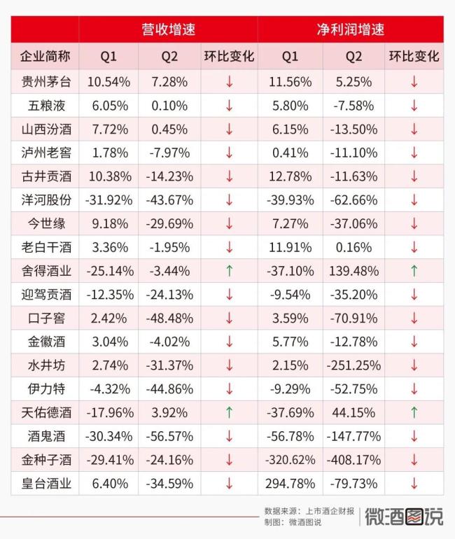 首先,“下调”已经成为主基调。19家白酒上市公司里,15家企业二季度营收增幅为负,净利润方面情况更为严峻,仅有贵州茅台、老白干酒、舍得酒业、天佑德酒4家实现正增长或减亏,其余15家企业净利润均呈现负增长,其中顺鑫农业、水井坊、天佑德酒、酒鬼酒、金种子酒、皇台酒业二季度出现亏损。