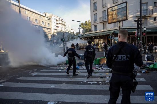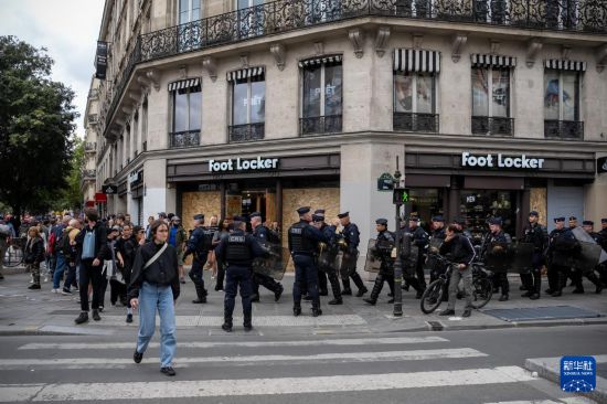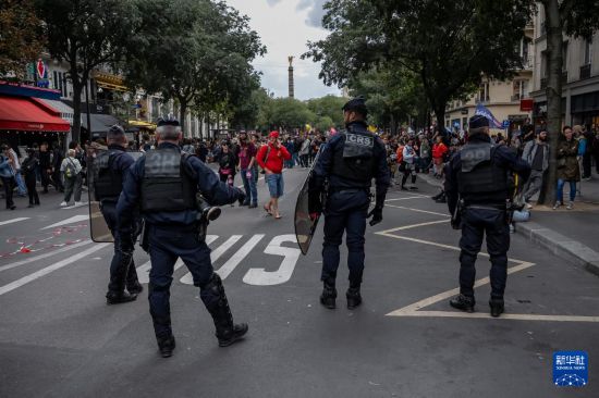 9月10日,警察在法国巴黎夏特莱广场附近的游行示威现场警戒。新华社发(奥雷利安·莫里萨尔摄)