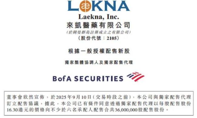 2025年9月10日,来凯医药(Laekna,股票代码:2105.HK)公告称,将以每股16.30港元向不少于六名承配人配售3600万股新股,配售价较9月9日收市价折让约9.5%,预计可筹得净额约5.78亿港元。其中,约九成资金将用于支持临床及临床前管线的持续研发,其余则用于日常运营。目前,来凯医药尚未实现营收,2025年上半年,其归母净亏损为1.3亿元。