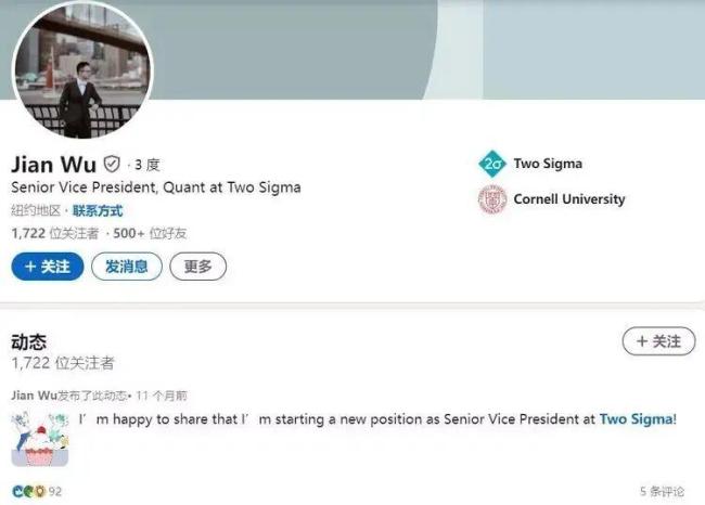 吴舰在2011年取得了清华大学的工学学士学位,并于2017年从美国康奈尔大学获得了哲学博士学位。他曾在美国知名做市商Citadel实习,2018年4月加入顶尖量化对冲基金Two Sigma,从量化研究员做起,不到三年就升任副总裁,2023年1月被提拔为高级副总裁。