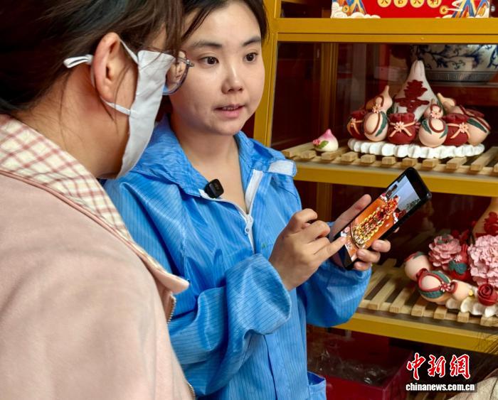 马瑞(右)正在为顾客介绍店里的花饽饽。王牧雨 摄