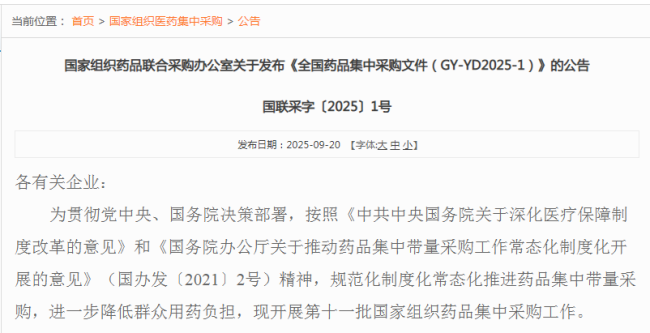 9月20日,国家组织药品联合采购办公室(以下简称“联采办”)发布《全国药品集中采购文件(GY-YD2025-1)》和《关于开展第十一批国家组织药品集中采购投标企业报名工作的通知》。这意味着酝酿了两个月的第十一批国采方案靴子落地,将于10月21日在上海开标。