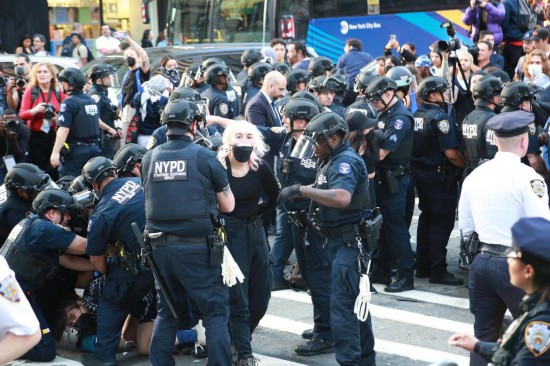 6月10日,在美国纽约曼哈顿下城联邦广场移民法庭附近,警察控制抗议者。新华社记者刘亚南摄