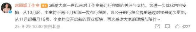 9月29日,赵丽颖工作室宣布调整行程发布方式。从10月起,工作室将不再于月初统一发布行程图,可公开的行程会提前通过对接号同步更新。从11月起,每月16号,工作室将会开启新的营业板块,感谢大家的理解与陪伴。