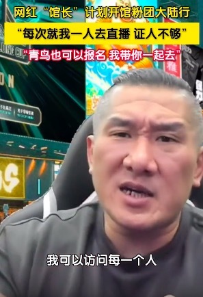 10月13日晚,中国台湾网红“馆长”在直播中称计划开“馆粉团”开启大陆行直播。其表示,“每次就我一人去直播,证人不够,想在每个城市都开这种旅游直播,青鸟也可以报名,我带你一起去。”他同时还强调,这个团不是盈利性质的旅行团,这是好朋友约着出去玩,自己能做的事情就是帮订酒店之类的,会有折扣。