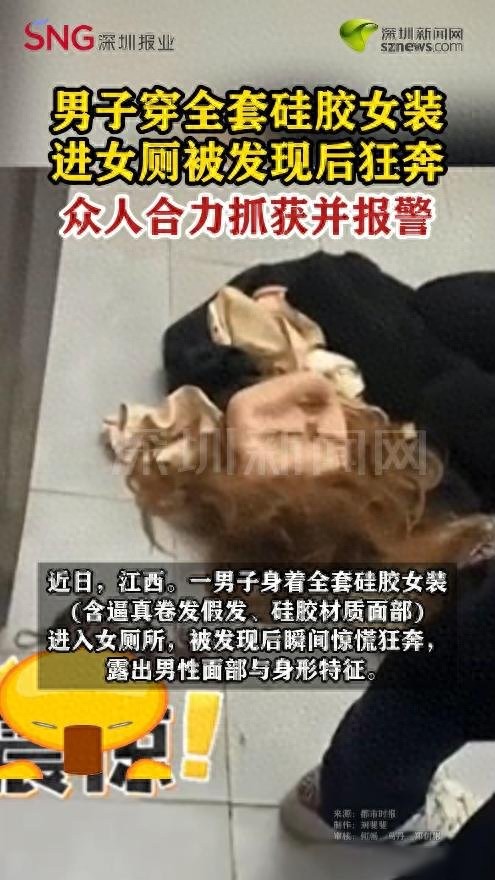 以假乱真!男子穿硅胶女装进女厕 伪装惊现女厕!近日,在江西发生了一起男子伪装进入女厕所的事件。这名男子身穿全套硅胶女装,包括逼真的卷发假发和硅胶面部,试图混入女厕所。被发现后,他惊慌失措地逃跑,过程中露出男性面部和身形特征。现场的人们察觉到异常后迅速围堵,最终将其控制并报警。有网友评论称,这种“画皮式”伪装令人感到非常震惊。目前,该事件仍在调查中。