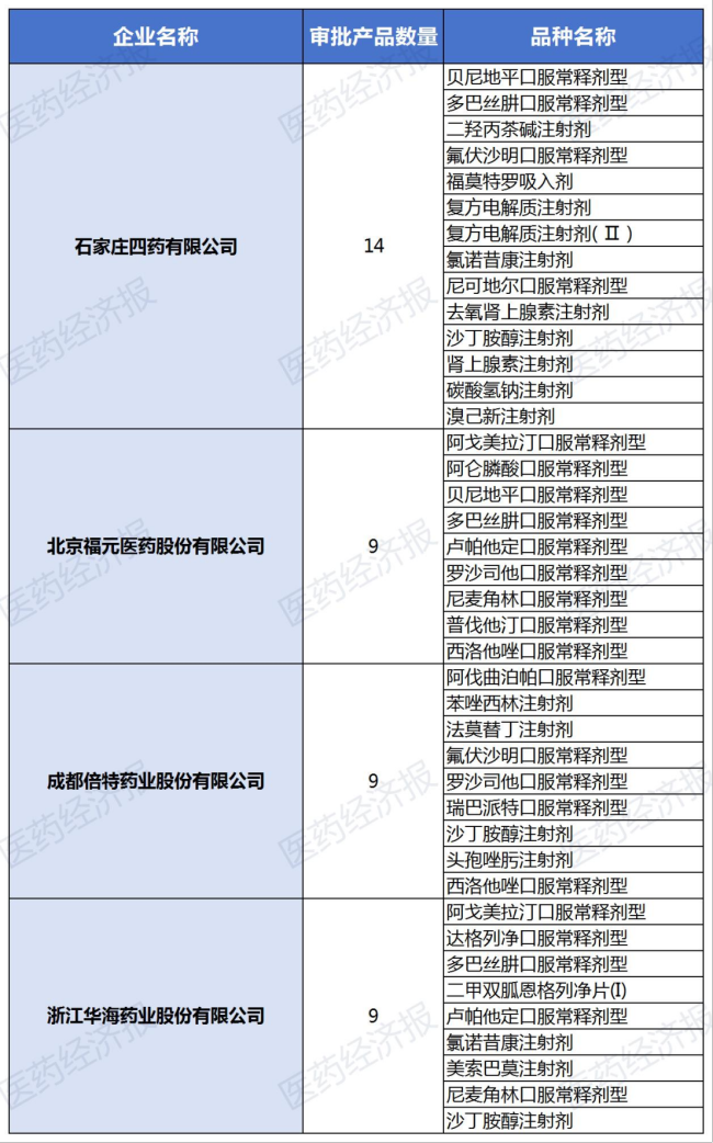 企业方面,此次参与集采信息公示品种数量最多的企业为石家庄四药,有14个品种,北京福元医药、倍特、华海药业均为9个品种。