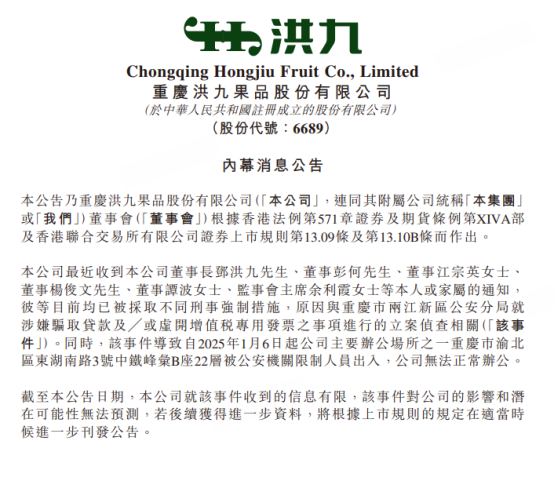 2025年4月,洪九果品发布公告,称公司收到公司董事长邓洪九、董事彭何、董事江宗英女士、董事杨俊文、董事谭波女士、监事会主席余利霞女士等本人或家属的通知,彼等目前均已被采取不同刑事强制措施。