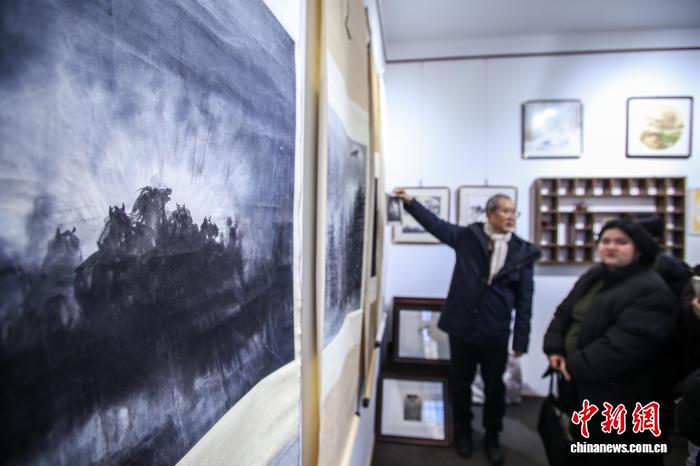12月29日,宫春虎水墨画马艺术中心“喜迎马年,五代画马人马画艺术展”在天津古文化街海雅茶园启幕。展览展示了中国现代水墨画马先驱徐悲鸿先生及其弟子韦江凡、再传弟子宫春虎以及两代学生的马画作品。图为在津外籍留学生参观展览。中新社记者 佟郁 摄