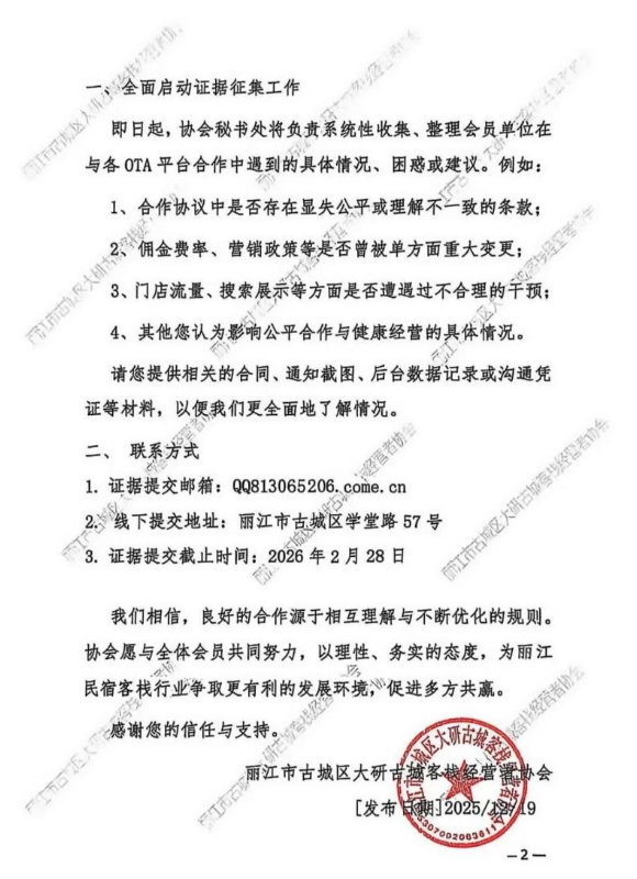 与此同时,来自云南实体经济端的集体反抗也在2025年末密集出现。就在丽江旅拍风波引发关注的同时,云南省旅游民宿行业协会及丽江市古城区大研古城客栈经营者协会相继发布决定,正式启动对携程等OTA平台“不正当竞争反垄断”的维权工作。协会指出,平台利用市场支配地位,实施“二选一”霸王条款、单方面随意涨佣、屏蔽流量等行为,已严重侵害经营者权益,破坏市场秩序。这标志着,面对“超级平台”对流量与规则的垄断,地方文旅行业不再仅是分散的投诉者,而是开始通过有组织的法律与集体行动,试图打破“弱肉强食”的格局,争夺公平的经营空间。从旅拍商户对“避雷帖”流量的无奈,到民宿行业对“平台规则”的抗争,共同揭示了流量垄断已成为制约在地文旅经济发展的关键性生态瓶颈。