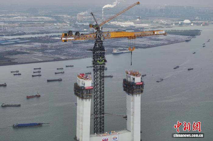 中新网东莞3月26日电 (记者 蔡敏婕)粤港澳大湾区核心枢纽工程狮子洋通道关键控制性工程——狮子洋大桥实现东、西主塔26日11时许封顶,转入上部结构施工阶段。