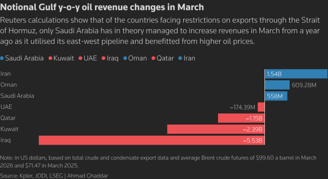 数据显示,随着美国、以色列与伊朗的冲突导致霍尔木兹海峡事实上被封锁,大多数海湾国家的原油和凝析油出口量确实出现了下滑。伊拉克和科威特的名义石油出口收入同比均暴跌约四分之三。然而,另一端的数据却显示,伊朗的石油出口收入同比增长了37%,阿曼增长了26%,沙特阿拉伯的石油收入增长了4.3%。
