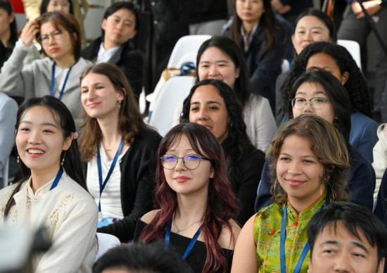4月8日,参加“共航蔚蓝”中美青年友谊行活动的中美青年学生在闭幕式上。新华社记者 陈浩明 摄