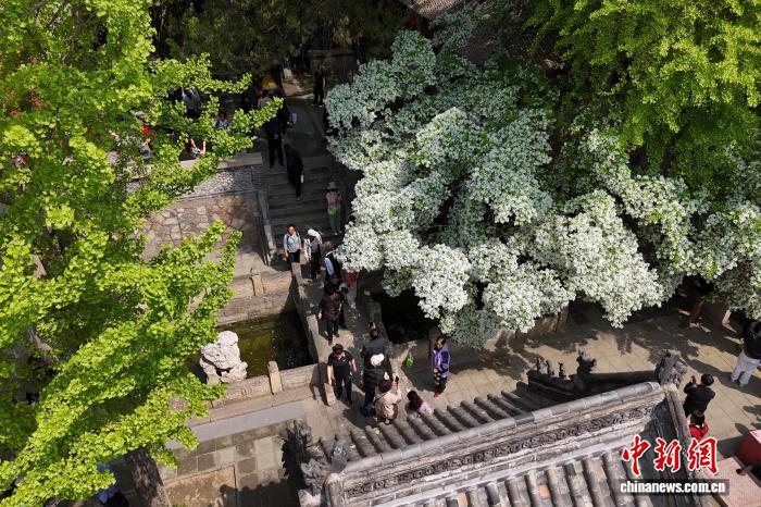 4月15日,泰山王母池百年流苏古树迎来盛花期,吸引游客“打卡”,定格春日限定美景 。(无人机照片)陈阳 摄