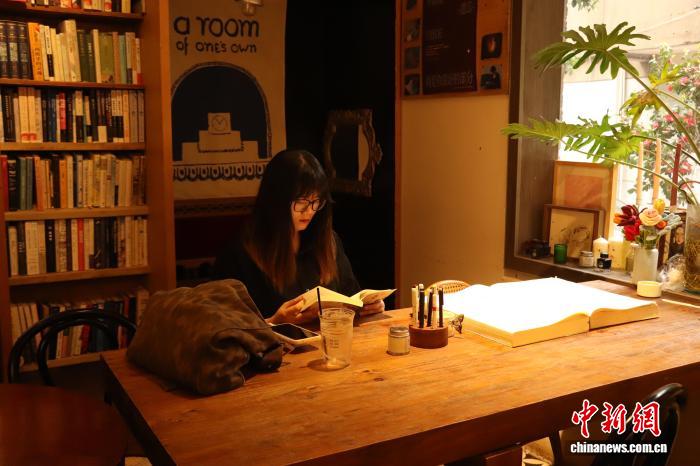 图为南昌市东湖区念青书店,读者在店内喝着咖啡,阅读自己喜欢的书籍。熊锦阳 摄