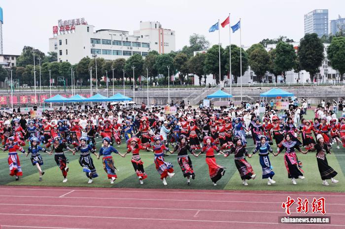 图为在广西三江侗族自治县古宜镇江川小学,学生齐跳多耶舞。龚普康 摄