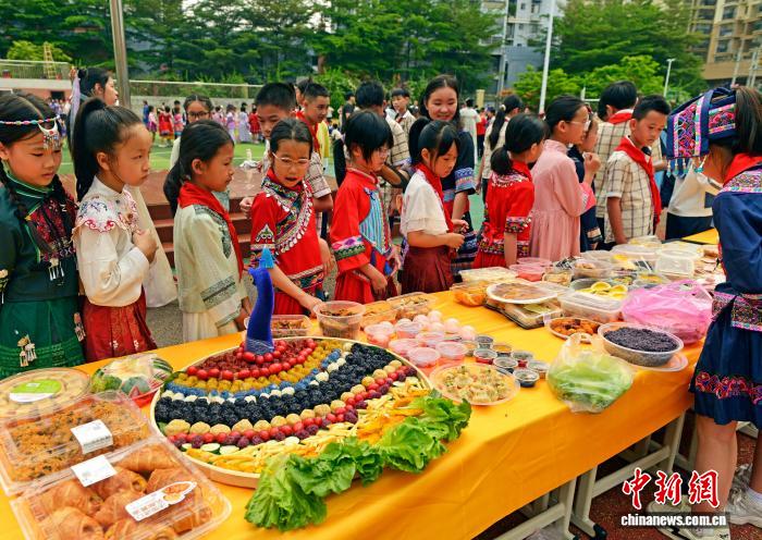 图为在广西南宁市邕宁区清泉小学,学生在体验特色美食。滕忠 摄