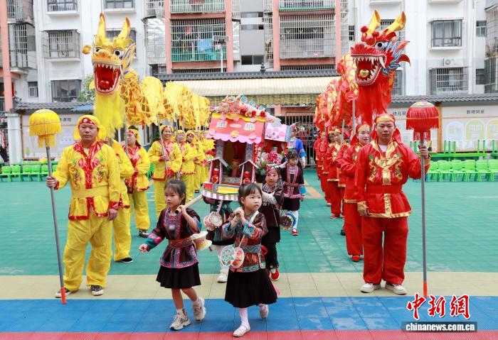 图为在广西三江侗族自治县古宜镇江川小学,学生在参加民俗展演活动。龚普康 摄