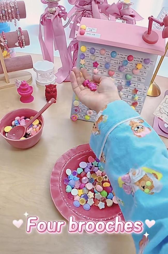 五颜六色的珠子被随机舀起,商家再把每个珠子对应的商品如手链、发圈、各种毛绒挂件等一一展示,精心包装成惊喜礼盒寄给买家