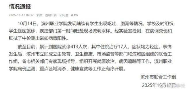 官方通报滨州职业学院多名学生腹泻 诺如病毒阳性确诊