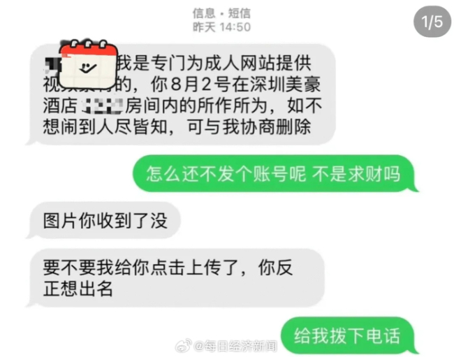 近日,一名网友在社交媒体上发文称,8月他与女友入住深圳一家酒店后,9月被人勒索。对方声称手头有他们在酒店的视频,并要求支付3万元人民币,否则将把视频发布到成人网站。该网友表示,由于他目前在国外留学,家人已代他报警