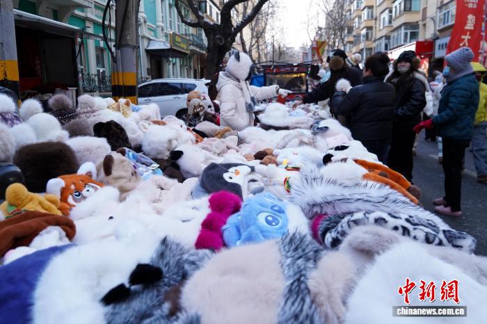 12月2日,黑龙江哈尔滨,游人选购保暖衣物。当日,黑龙江哈尔滨最高气温今冬首次降到-10℃以下 ,在哈尔滨红专街早市,棉帽子、大花袄等保暖物品摆上街头,游人纷纷选购。中新社记者 赵宇航 摄