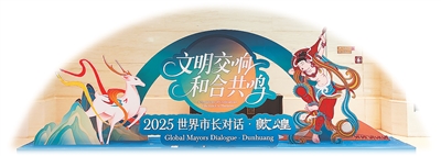 2025“世界市长对话·敦煌”会场布景。  本报记者宋朝军摄  中外嘉宾参加“世界市长对话·敦煌”开幕式。  新华社记者范培珅摄  外国嘉宾参观了解莫高窟风沙环境综合治理项目。  新华社记者范培珅