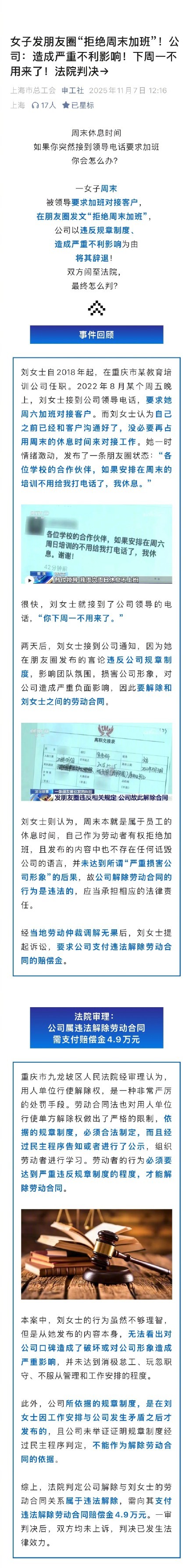 女子发朋友圈拒加班被辞获赔4.9万 法院判公司违法解除合同