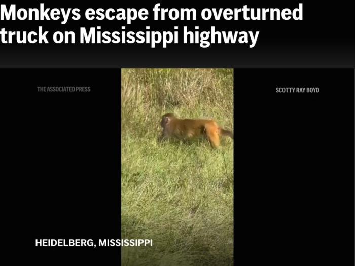 美国一卡车侧翻实验用猴逃脱 当地警告“具有攻击性”