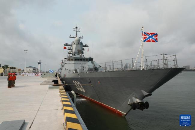 4月15日,由俄罗斯海军“完美”号、“凛冽”号护卫舰和“佩琴加”号中型油船组成的舰艇编队抵达广东湛江某军港码头,开始为期5天的友好访问。多艘舰艇依次靠泊,展示了两国海军之间的友好关系