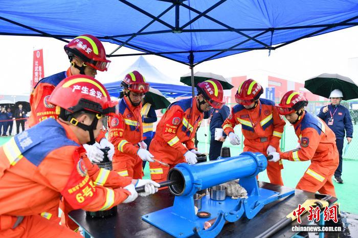 中新网济宁10月15日电(沙见龙 罗庆银)15日,在位于山东济宁的国家矿山应急救援山东特勘队比赛现场,钻探组的比拼正酣。